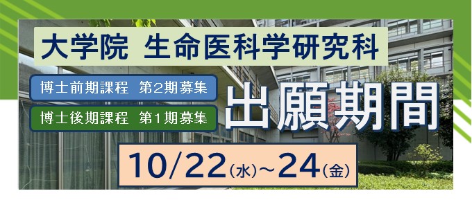 生命医科学研究科2026年度募集、博士前期課程第2期、及び博士後期課程第1期の出願期間は、10月22日~24日です。